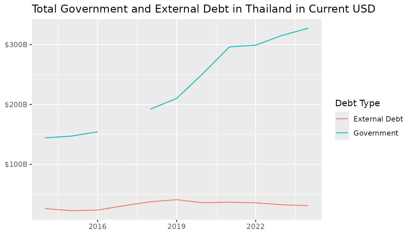 debt_levels <- bind_rows(government_debt, external_debt_total)We can now visualize total government and external debt in Thailand: