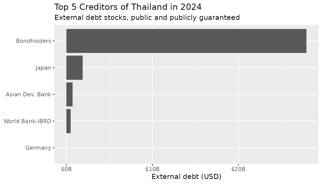 In the following examples, we focus on Thailand (ISO-3 country code “THA”). Understanding the composition of a country’s debt—distinguishing between total government debt and external debt owed to foreign creditors—helps assess fiscal vulnerability and identify potential risks.